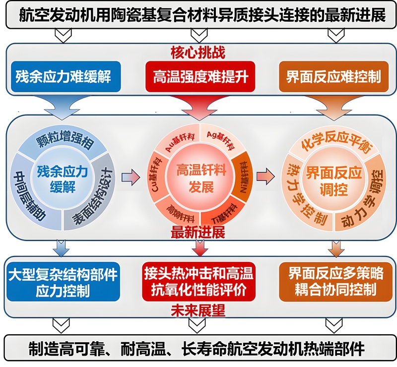 The paper further points out that future efforts should be devoted to developing full-scale stress coordinated control methods for large-scale complex components, strengthening research on the performance evolution and life assessment of heterogeneous joints under extreme working conditions such as thermal shock and high-temperature oxidation, and advancing the coordinated regulation of multiple mechanisms including chemical equilibrium, thermodynamics and kinetics, so as to establish an integrated technical system covering stress design, material development and interface control, thereby providing systematic solutions for the manufacturing of high-reliability and long-life hot-end components of aero-engines.